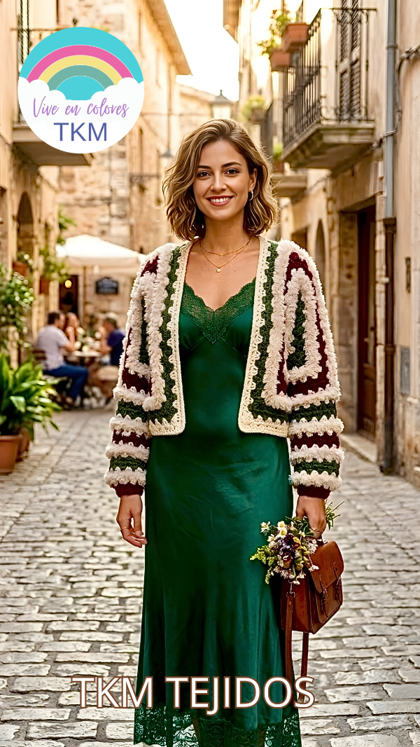 Este proyecto es perfecto para tejedoras que desean crear una prenda clásica del crochet, pero con una vuelta de rosca que la convierte en una chaqueta moderna, llamativa y atemporal.